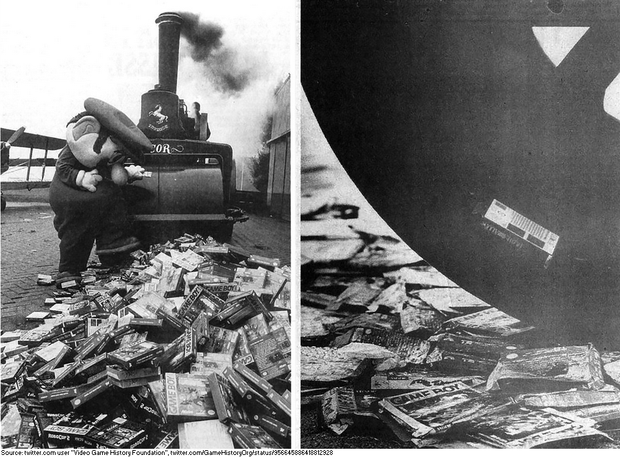 A man in a Mario mascot suit helps a steamroller operator destroy a shipment of illegal Game Boy games seized at the border in the Netherlands in 1994.