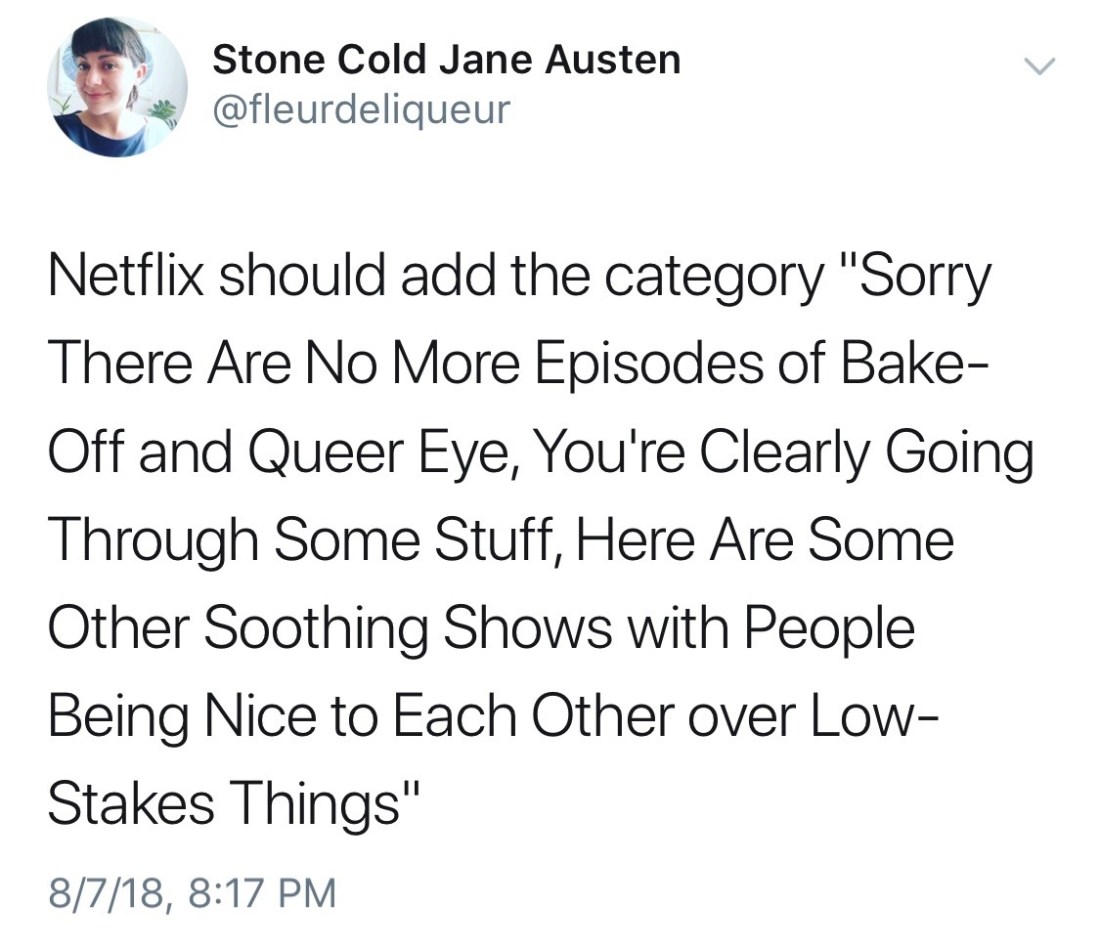 i’d also suggest the bbc historical farms series–it’s not on netflix, but it *is* mostly on youtube. the metafilter guide that originally introduced me to it is here. there are a bunch of different series of it, now, and each one is a group of archaeologists and historians living on a period location–victorian farm, they live in a farmhouse from the era, and they farm and raise animals and etc wearing period clothing, using period tools and sources as guides. and it sounds like it could be cringey, but they’re all experts in their fields and actually really invested in trying to do things well, so instead it’s a bunch of shows about teamwork and being friends (most of the core team stays the same) and learning things, and it’s delightful.