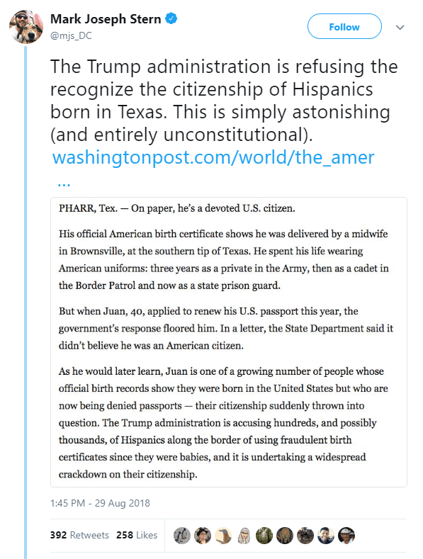 This is also happening in the context of an extremely close Senate election in Texas where a Democrat, Beto O’Rourke, is in a statistical tie with wildly unpopular Republican incumbent Ted Cruz. There’s a lot of energy on the Democratic side of this election, especially in this state, and you know what happens if your citizenship is in question, if your birth certificate is no longer proof of where you were born?