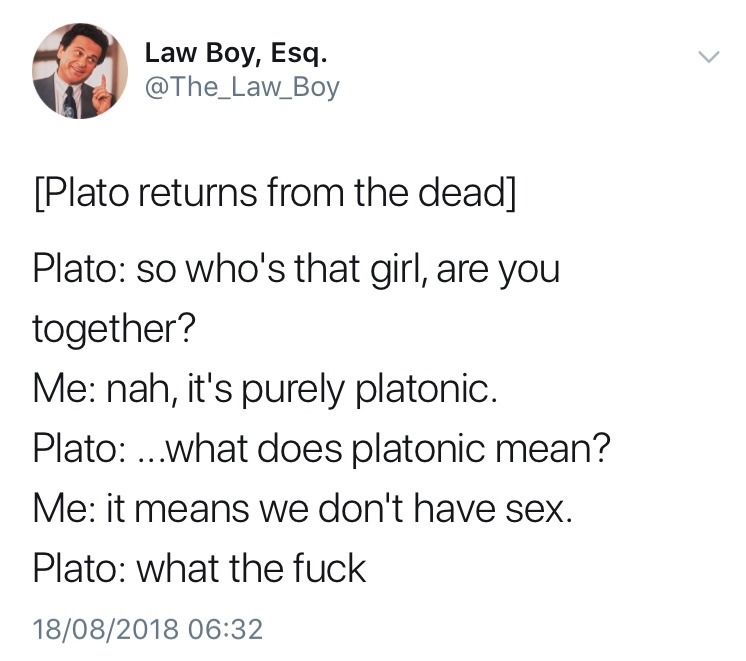 So I actually know the origin of this term because it came up when I studied Plato in my classes. Basically, in ancient Greece it was a super common practice for teachers to fuck their students. Like all the time. It was considered a way for the student to “pay” the teacher. Plato thought this was bullshit. He felt that a student could not properly learn from someone who was truly only interested in having sex with them. He didn’t fuck his students and derided those who did. Other teachers who refused to fuck their students were said to have “platonic” teaching relationships with them – so named because they were following Plato’s example. So the reason it’s called a Platonic relationship is because Plato was heavily anti-teachers-fucking-their-students and it’s one of the few things he was ever even remotely correct about.
