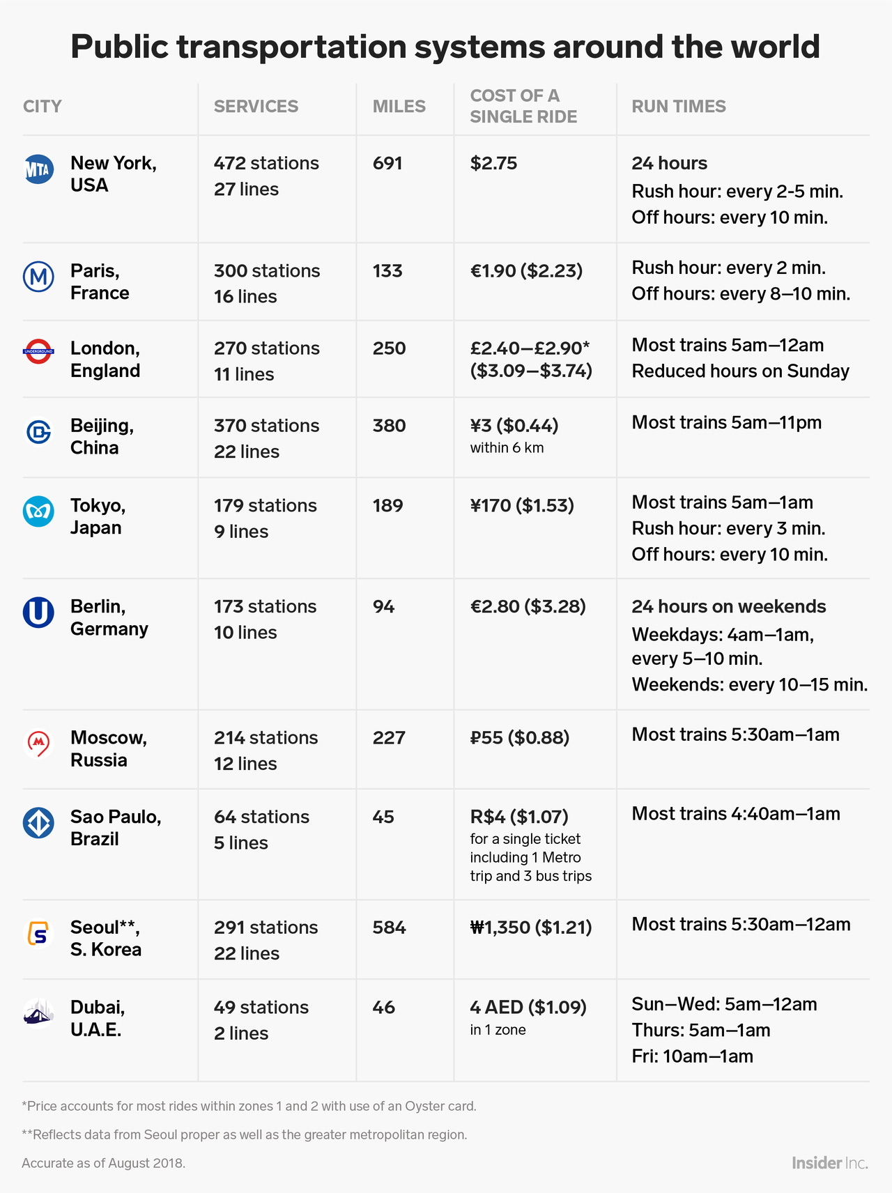 Navigating another country’s public transportation system can be an exciting experience. This is how the metro systems in 10 major cities compare. skysky1670 September 11, 2018 Published by skysky1670 View all posts by skysky1670 Published September 11, 2018
