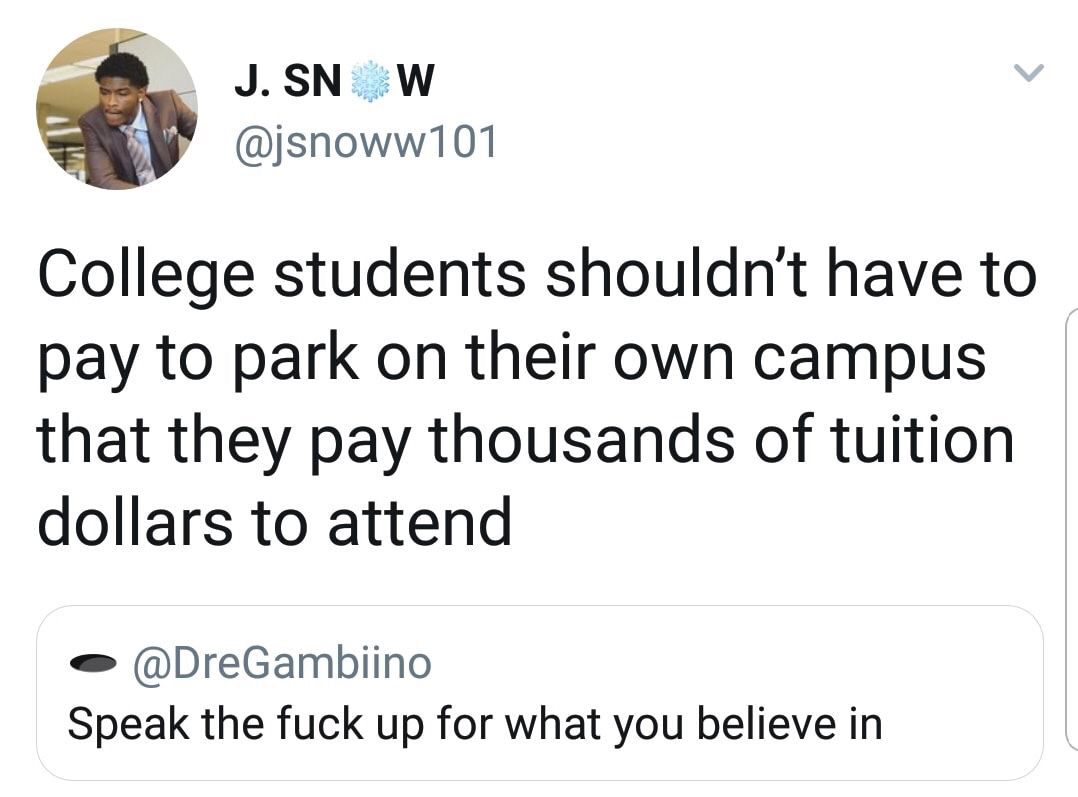 Did I mention that on Wednesday I cannot even use my 110 dollar parking pass bc lots fill at 0630 and I dont get to the facility until nearly noon..which requires students to spend 6 dollars every Wednesday.