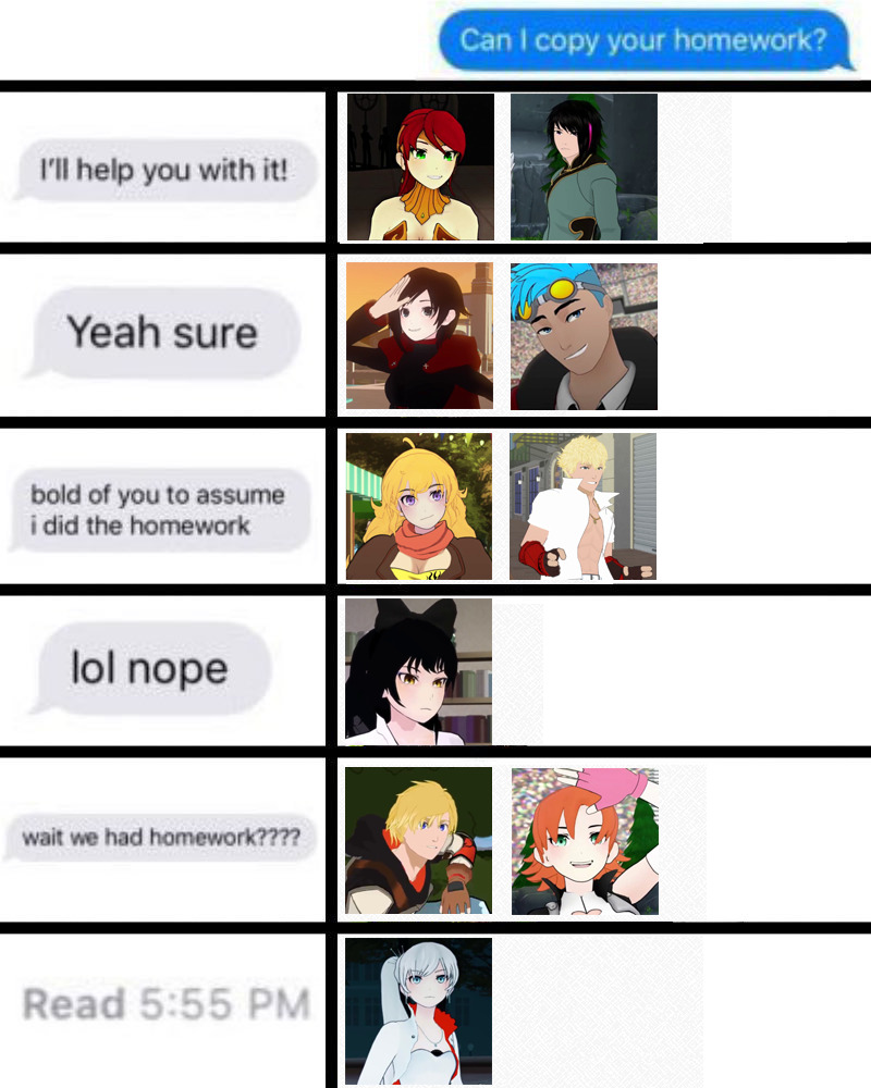 skysky1670 Uncategorized September 28, 2018December 16, 2018 1 Minute carthonasi: i saw this meme going around and i just had to make a rwby version Source: carthonasi Share this: Share on X (Opens in new window) X Share on Facebook (Opens in new window) Facebook Like Loading... Related Published by skysky1670 View all posts by skysky1670 Published September 28, 2018December 16, 2018