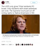 Basically, what’s going on right now is that the GOP is trying to push Heidi Heitkamp, democratic senator for North Dakota and first woman to hold the seat in our state, out of her seat by means of voter segregation. Following Kavanaugh being accepted onto the supreme court, she’s been seriously dropping in the polls. It’s been an absolute shitshow here because our state makes or breaks the Republicans gaining control of the senate. There’s a REALLY good piece on what’s going on here.
