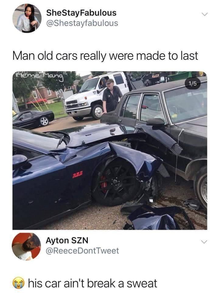 omg y’all know i love old cars but newer ones are SAFER because they are meant to absorb the impact so it doesn’t transmit all that force to your bodies this has been a psa thank you