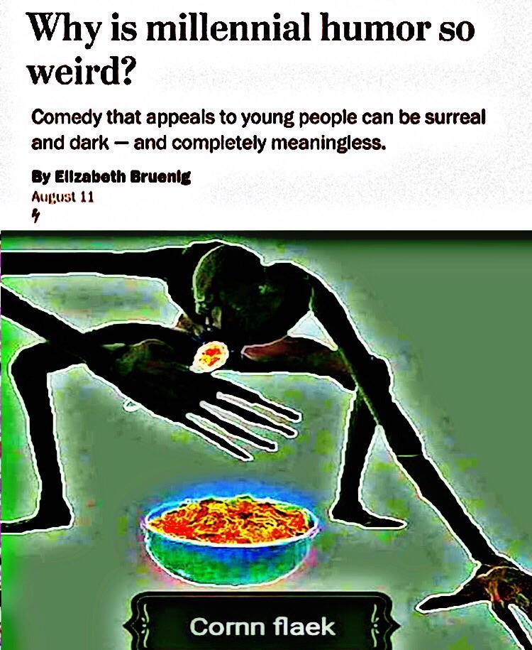 it’s because reality is terrifying and our world’s dying, and our developmental years were spent in a constant state of using increasingly nonsensical humor to cope