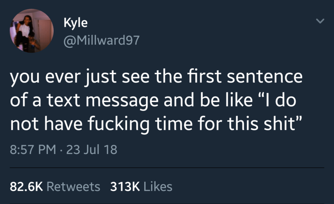 skysky1670 Uncategorized November 18, 2018December 16, 2018 1 Minute blackberryshawty: Literally sometimes just the first line preview is enough to be like “I don’t have the energy for this” Share this: Share on X (Opens in new window) X Share on Facebook (Opens in new window) Facebook Like Loading... Related Published by skysky1670 View all posts by skysky1670 Published November 18, 2018December 16, 2018