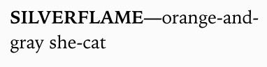 I assume that the cat described in OP is a dilute or silver tortie, since /I/ would assume a “flame” would mean orange stripes. She doesn’t even have to be dilute, though. She could be a silver instead of a classic (brown) or black. Silverflame is an extremely plausible cat.