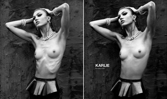 Supermodel Karlie Kloss was photoshopped to look less thin for a Numero campaign. There are so many things wrong with this. Models are forced to be incredibly thin to fit a certain aesthetic, but when they do, they’re so emaciated that they have to be photoshopped to not look sick.