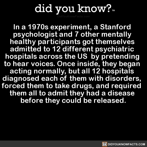 Rosenhan ans his colleagues did not pretend to hear voices, they pretended to hear a ‘hollow thud’- something with no basis in psychology. From the get go they were offering the doctors and nurses a chance to deny them entry, but despite the fact that the thing they were faking wasn’t even a real symptom, they were all admitted.